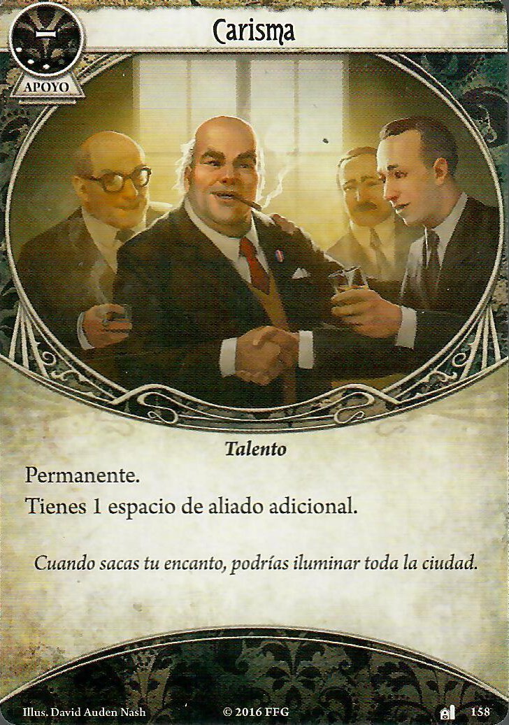De carisma solo puedo decir que nos vendrá bien si decidimos meter en nuestro equipo dos aliados, si sólo queremos tirar por un aliado único en nuestro mazo deberemos de pensarnos en añadir esta carta según lo que vaya ocurriendo en la campaña.
