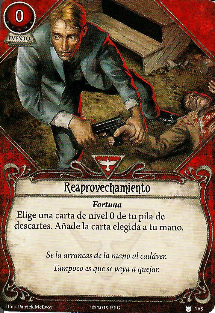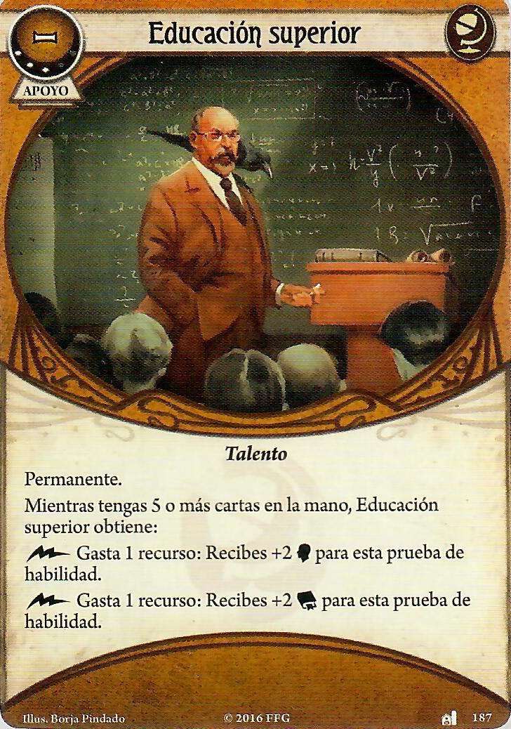 Las cartas permanentes, no tienes que pensar en cuando te van a salir, simplemente las tienes ahí desde el principio y que empiecen a rentar, y aquí es dónde está la última de las cartas en la lista de tabúes, en este caso perteneciente a las cartas «Encadenadas» y le han sumado +5 de exp, poniéndolo en un total de 8 exp. y es que Educación superior es el tomate en una pizza (no creo que deje de hacer nunca ejemplos con comida), ya que mientras tengamos 5 o más cartas en la mano podemos gastar un recurso para que nos de un +2 en intelecto o voluntad a la prueba de habilidad que estemos realizando, y aquí esta el combazo de Rex con esta carta, el va a ganar recursos por el Doctor Milan Cristopher, mientras que podrá robar cartas con su carta personal, con su habilidad de símbolo arcano y llevándote la lupa a la mano como acción rápida cuando ya no queden pistas, hay mas cartas que nos hagan robar cartas y recursos, pero con este combo a priori no deberíamos de tener ningún problema.