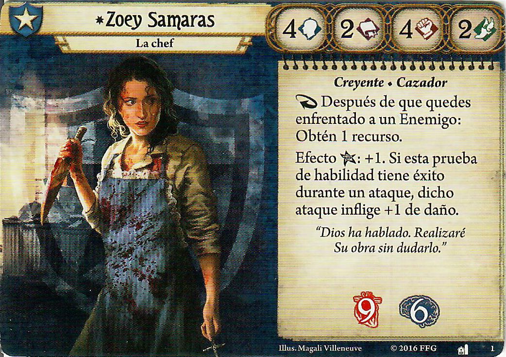 Si tenemos a Rex, tenemos Dunwich, y si tenemos Dunwich tenemos a Zoey, y que mejor compañera para reventar a los malos de este universo que la mejor cocinera de Arkham, Zoey tiene una habilidad que mezclada con su carta personal hace daño, y es una guardiana que tiene acceso a cartas que hacen daño, mucho daño, por lo tanto aprovechémonos de eso.