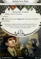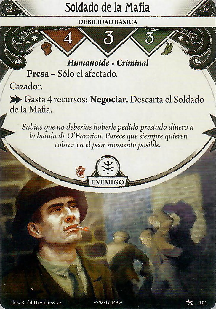El Soldado de la Mafia tiene un 4 en combatir lo que le hace estar por encima de la media y un 3 de vida, lo que le hace inmune a machetes y pistolas convencionales y te obliga a gastar al menos dos acciones en él por norma general. Lo único bueno es que su habilidad te da una forma de salir del paso sin tener que combatir, cosa que no hacen los otros dos.