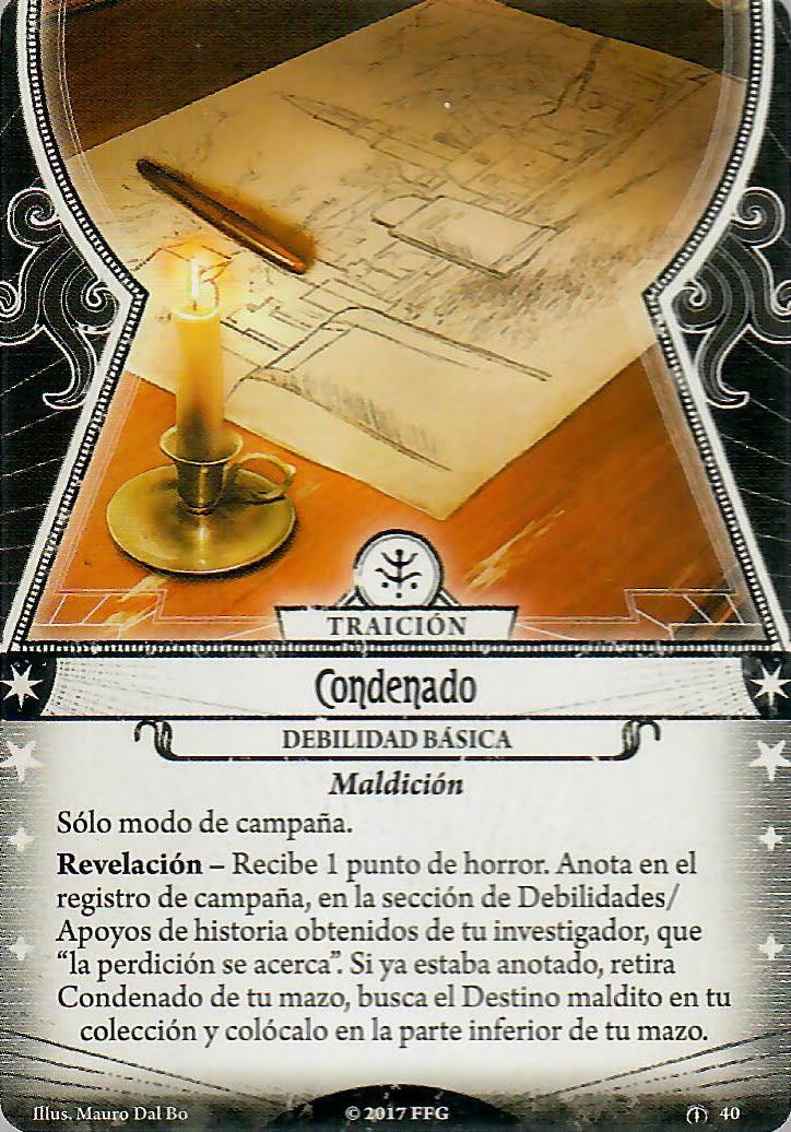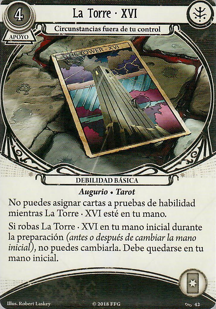 Estamos ante la debilidad que todo el mundo quiere tener en su mazo y su aventura. Si bien puede ralentizar un poco el juego al principio de la partida, tiene muchísimas otras ventajas. Por ejemplo, empiezas con ella en juego y sólo te puede afectar una vez por partida, ya que aunque recicles tu mazo, no volverá a salirte. Además no te evita el robo de una carta, ni el gasto de ninguna acción en jugarla o descartarla.
