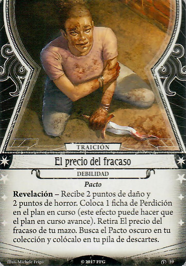 La primera debilidad en cascada. Nótese el juego de palabras, porque sino haces lo que te dice cascas. Pacto oscuro, la primera de las dos partes, no es una debilidad de las más duras, es incómoda, te quita dos recursos, una acción, una carta y hace dos puntos de daño. Pero dentro de lo malo, no es lo peor. Lo peor viene si no lo haces, en ese caso viene El precio del fracaso y te arruina la partida haciéndote daño, horror y añadiendo perdición. Sólo le falta, quitarte cartas de la mano, sacarte un monstruo, darte una colleja, dejarte en el paro y ligarse a tu pareja.