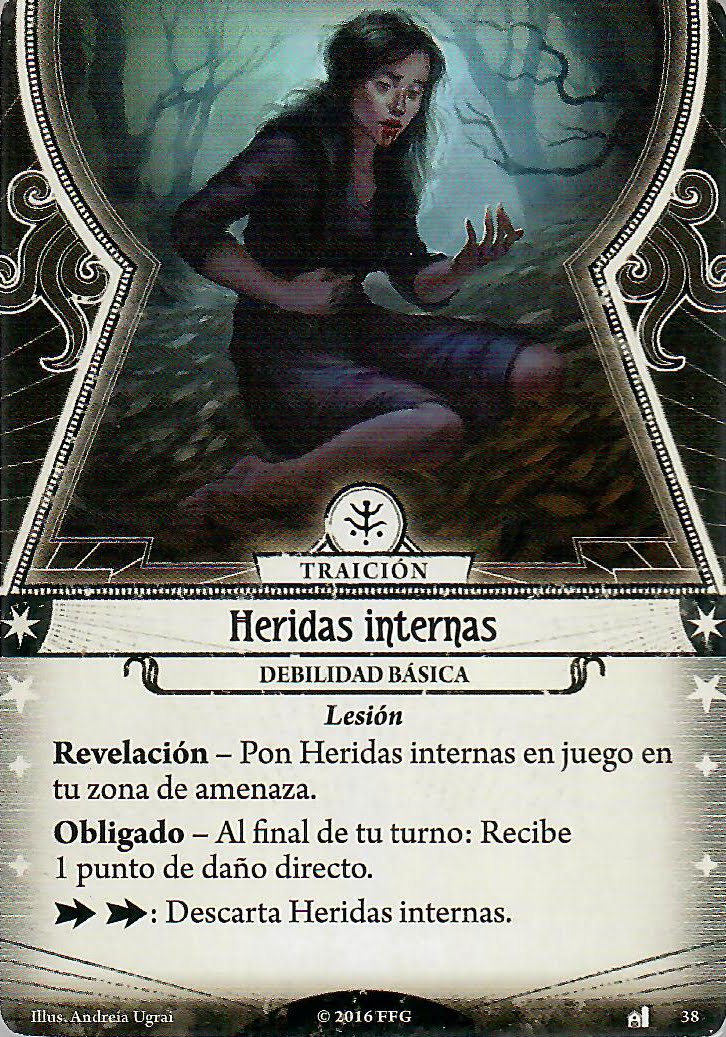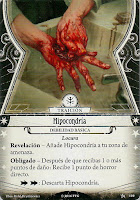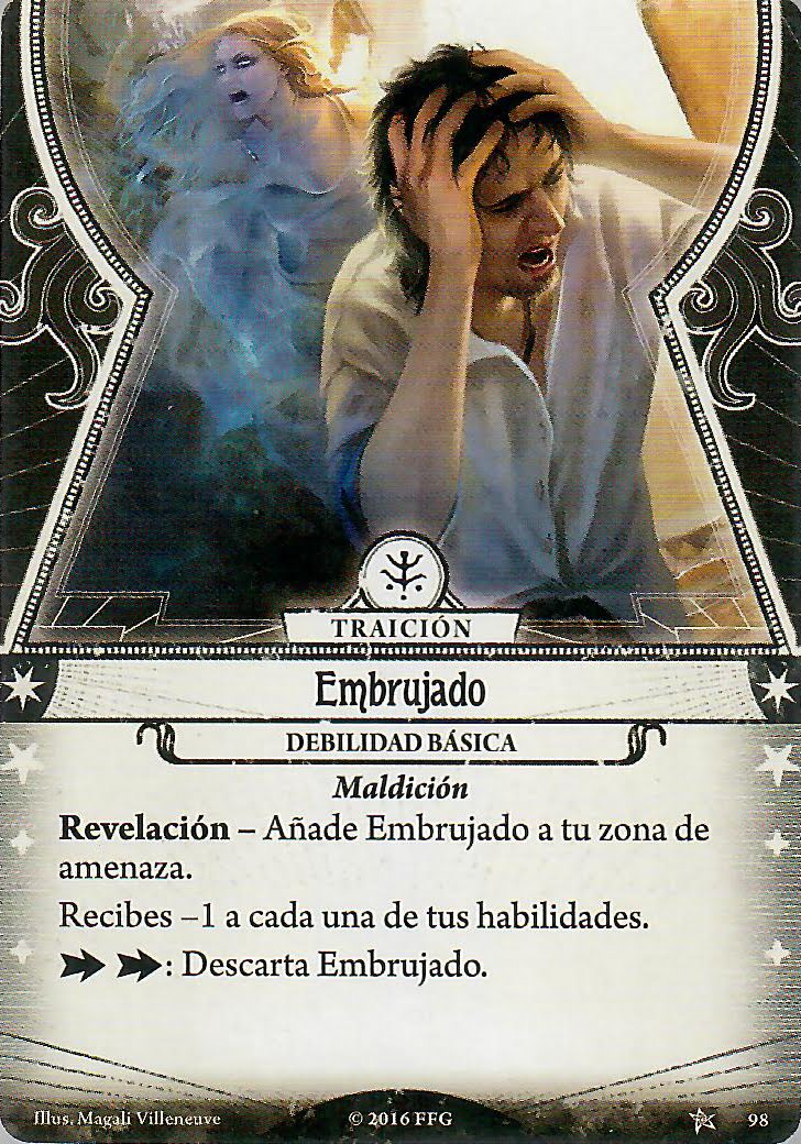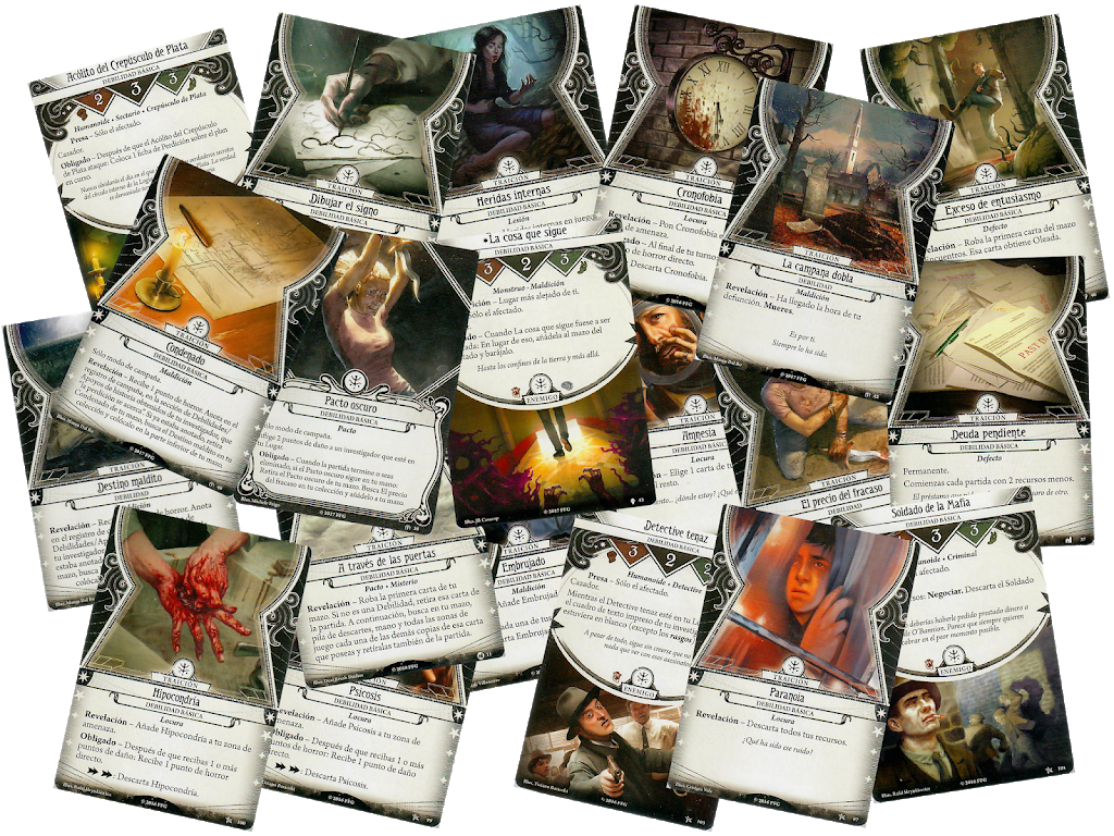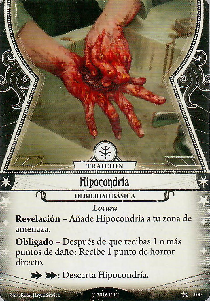 Tanto monta, monta tanto. Esta pareja de debilidades comparten modus operandi con la anterior, pero pueden llevarte a criar malvas antes de lo pensado. Si te salen en un momento complicado de la partida o estando enfrentado a enemigos, pueden ser un auténtico calvario, ya que intentar quitártelas supondría un ataque de oportunidad con el consiguiente daño/horror y acentuado por el efecto de la debilidad. Especialmente porculeras si eres de esos investigadores con un 5 es su puntuación de salud/cordura.
