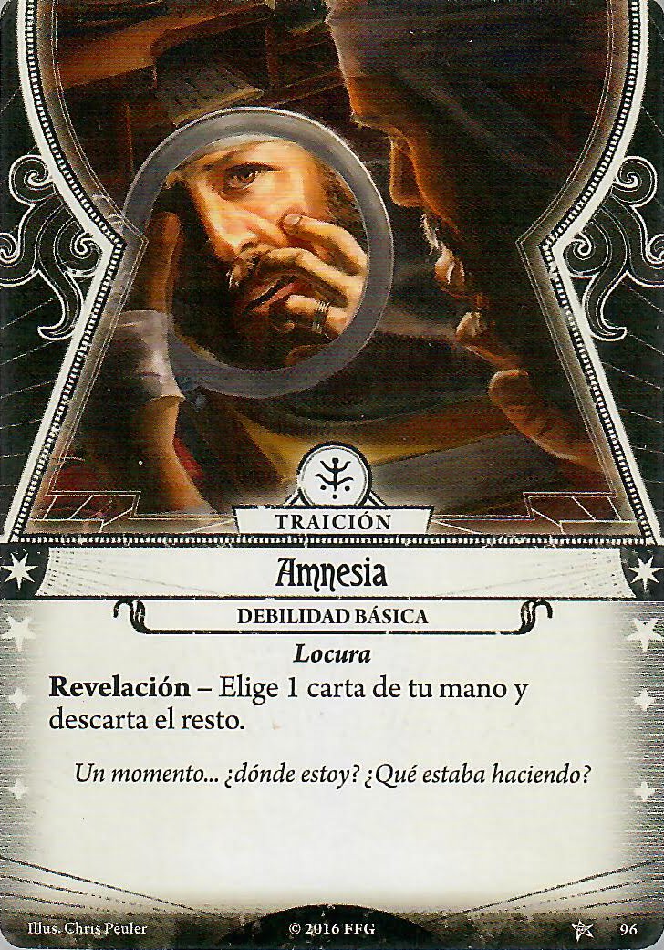 Otra carta del club de las dos acciones, pero en este caso no es especialmente mala. Los investigadores no suelen llevar 7 u 8 cartas en mano, a no ser que tengan un mazo preparado para ello. Con lo cual, es una carta que como mucho te va a hacer descartarte (a tu elección) de 1 o 2 cartas y gastar dos acciones. Parecido a las otras, pero sin el riesgo para tu salud/cordura.