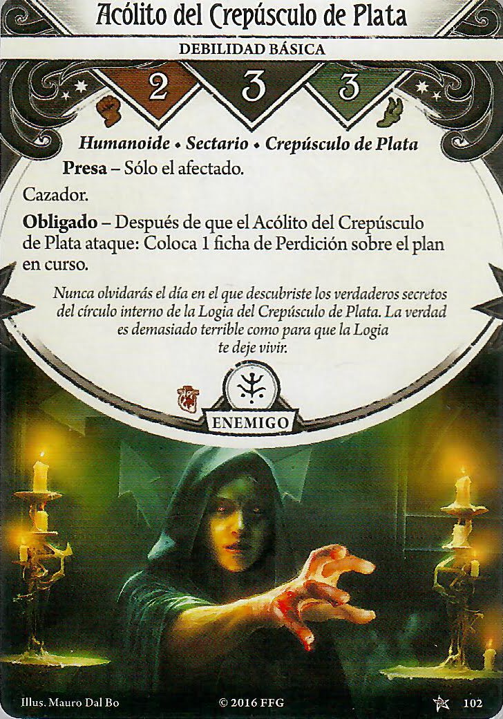 El Acólito de Crepúsculo de Plata rebaja su puntuación de combate, pero mantiene el 3 que lo hace incómodo, sobretodo porque deberías quitártelo de en medio rápido, no sea que le de por pegar a alguien y encima te haga un Antiguos males express.