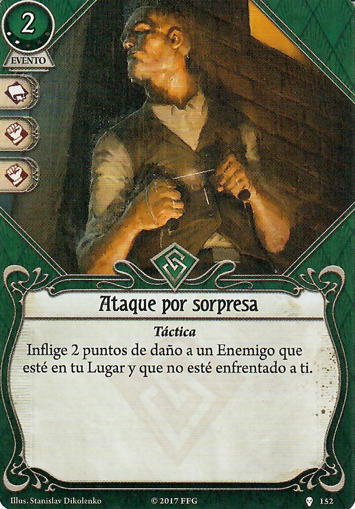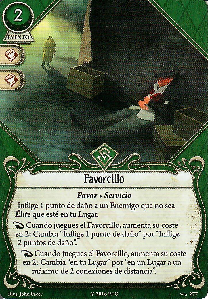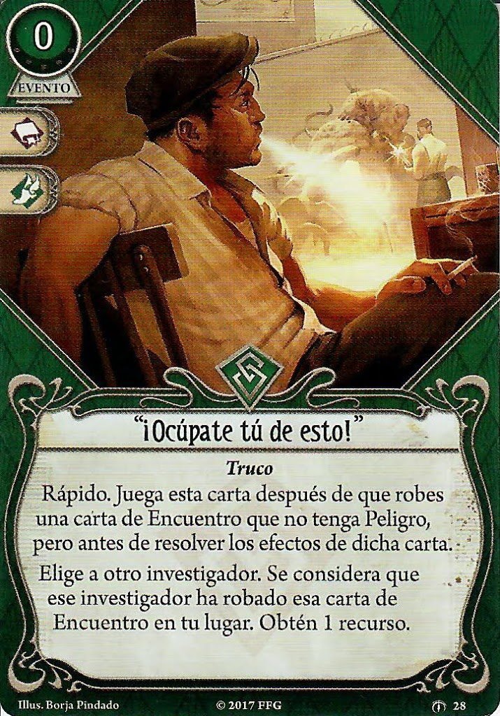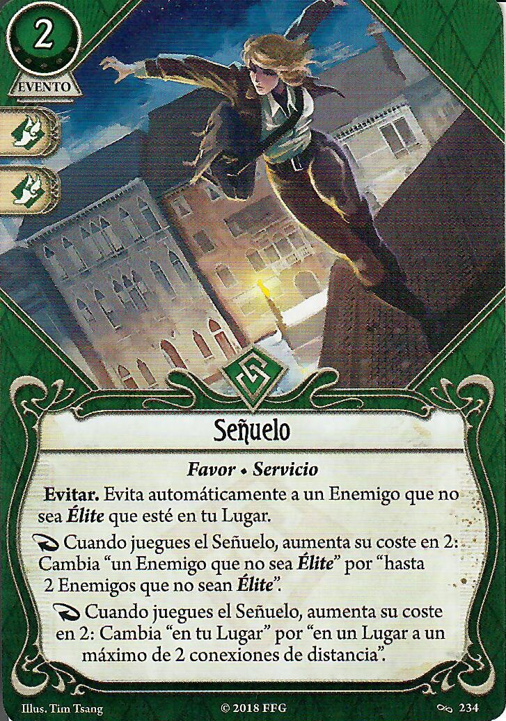 Ojo, hay que tener en cuenta que solo Señuelo podría usarse sin peligro a sufrir un ataque de oportunidad. Ni Favorcillo ni el Informe son acciones de combatir, evitar o negociar. Además, en caso de que estuvieras sin recursos, tienen unos muy buenos iconos para apoyar a un compañero, así que estas cartas muy probablemente no se vaya a quedar muerta en tu mano.