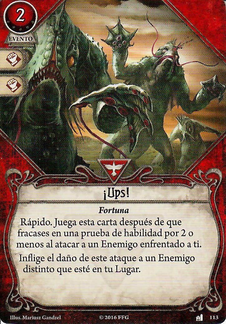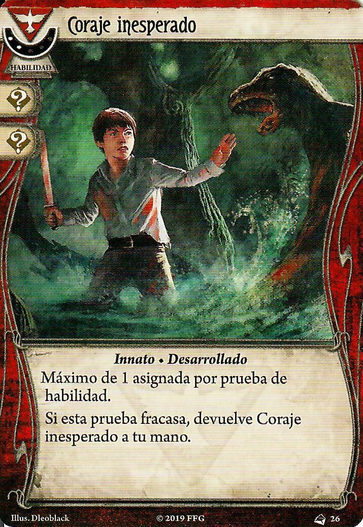 Y a ver, aunque no haya mucho de donde rascar, viendo las cartas con experiencia siempre podemos mejorar a algo. Coraje Inesperado (2) viene genial para ser un fracasado en la fase de mitos. Puedes ir asignándola a traiciones hasta que aciertes alguna y fallar menos en aquellas que dicen «haz X por cada punto por el que falles».