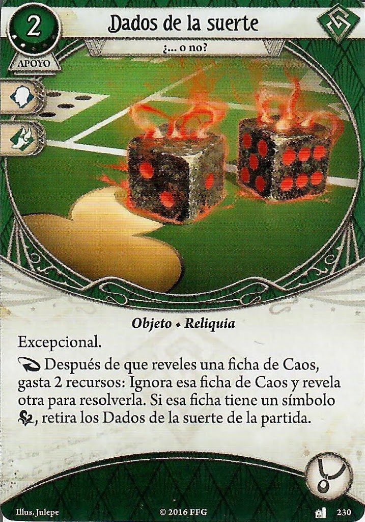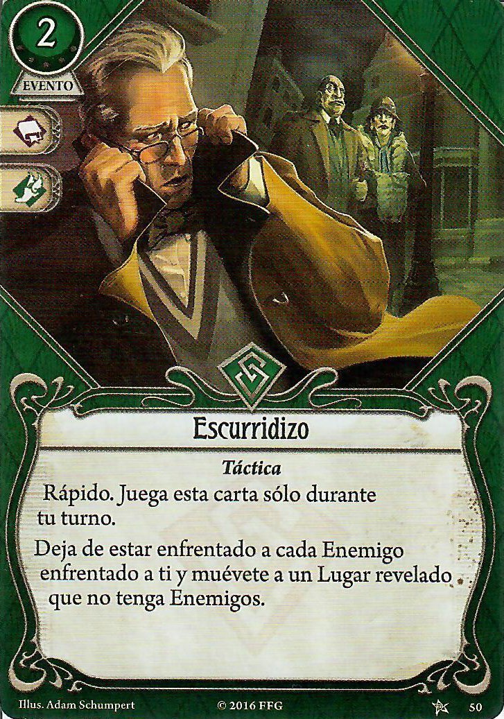 Con tantas acciones y recursos tenemos que descubrir siempre cual es el mejor modo de aprovechar los turnos para mantener el ritmo del escenario, por lo que cartas como Licenciado en las Calles van a ser especialmente útiles. Tener la posibilidad de poder investigar cómodamente o evitar enemigos desde el principio de la partida cambia totalmente la viabilidad de estos mazos. Aparte, tener a tu disposición cartas como los Dados de la Suerte o Escurridizo te van a permitir no parar nunca y mantenerte siempre ágil y adelantando el escenario. Los Dados de la Suerte pueden convertir fracasos en aciertos, mientras que Escurridizo puede ahorrarte muchas acciones de Evitar y movimiento.