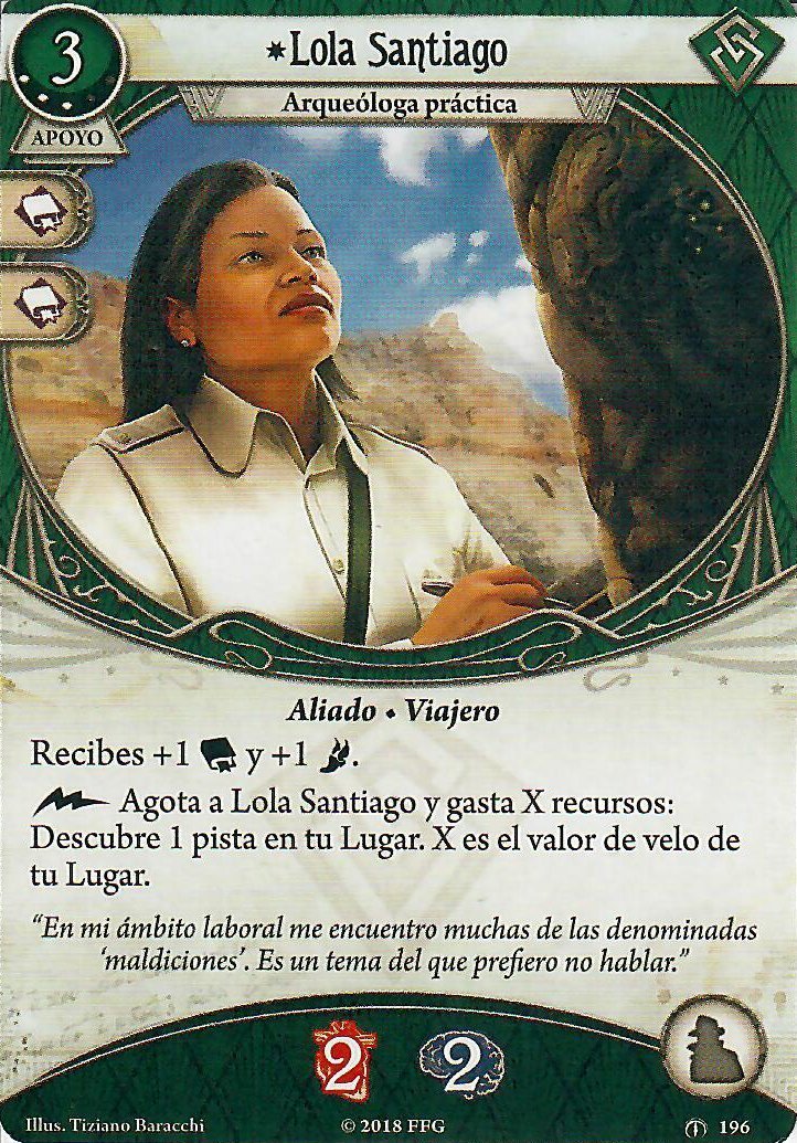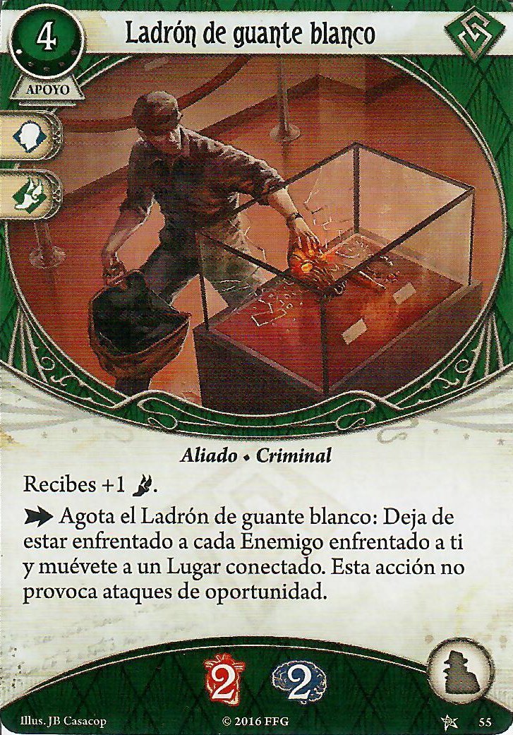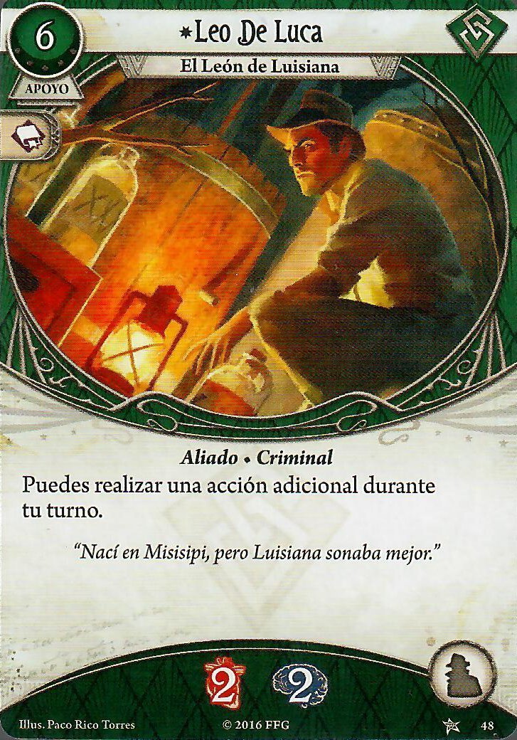 En cuanto a Apoyos, este arquetipo no necesita mucho, y en los que mejor se apoya es en sus aliados. Al mejorar el mazo, si queremos mantener a Leo de Luca vamos a querer un Carisma. Lola Santiago y Delilah O’Rourke son las dos grandes aliadas de Preston por su capacidad para convertir recursos en pistas o daño. Como opción alternativa, si simplemente queremos escapar rápido de los enemigos, el Ladrón de Guante Blanco siempre es una muy buena opción. Osea, no es muy emocionante, pero cuesta poquita experiencia, es un colchón decente de daño u horror y tiene un buen efecto.