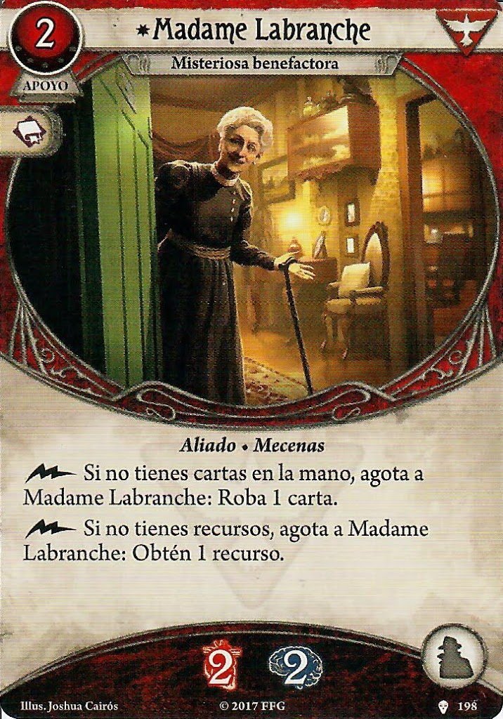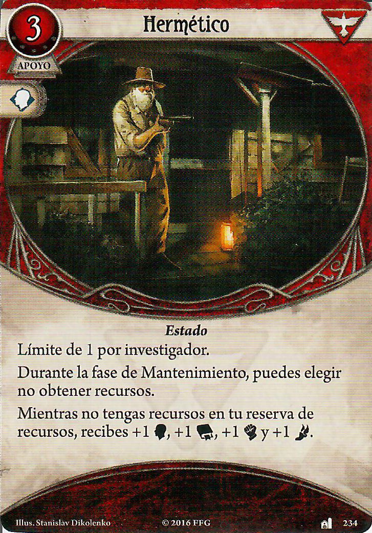 Si no conocéis este paquetito de cartas, es muy típico cuando quieres hacer una build de Hermético. Básicamente con una build de Hermético vas a intentar quedarte sin recursos para activar el efecto de esta carta. Luego, podrás combatir bien con el Hacha y además generar recursos y robo con Labranche, quien, por cierto, es un buen colchón de daño y horror.