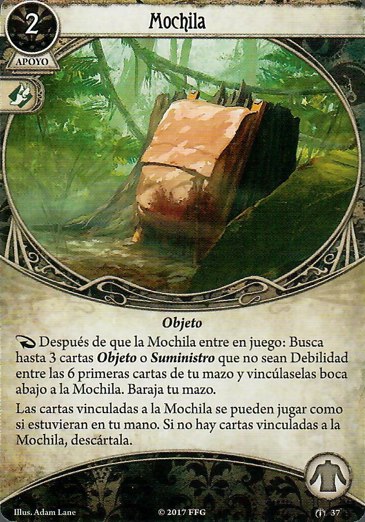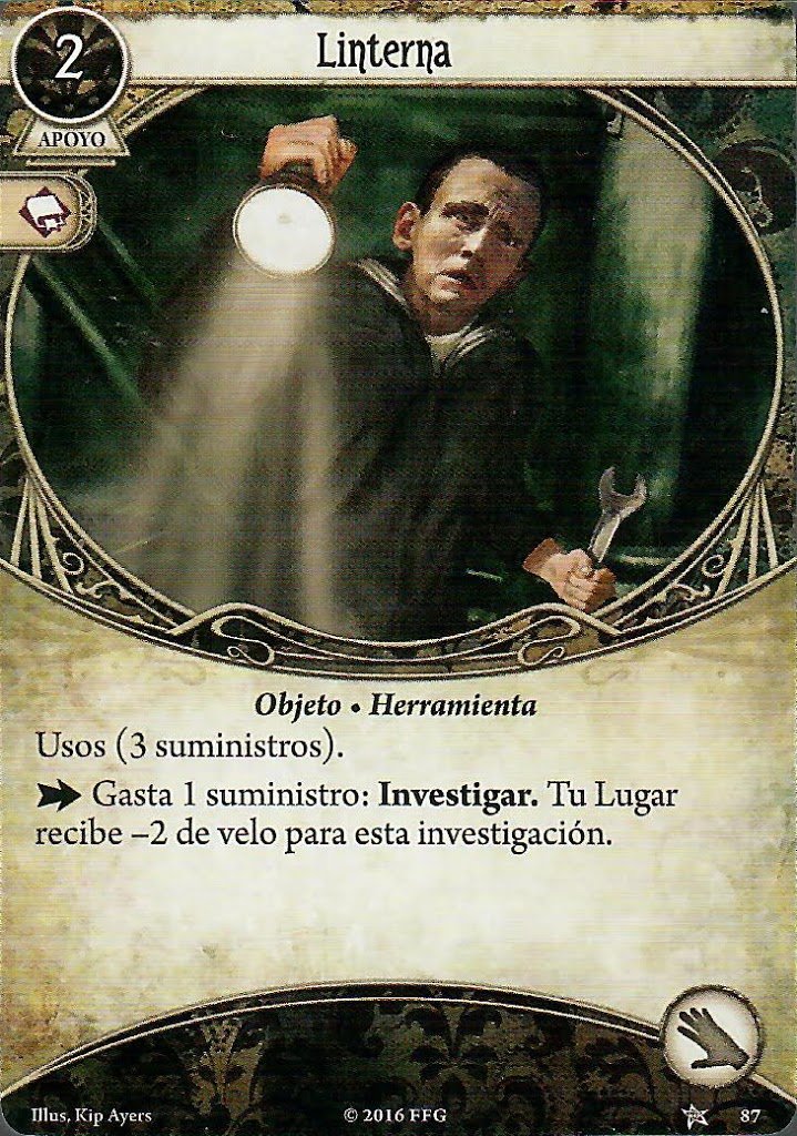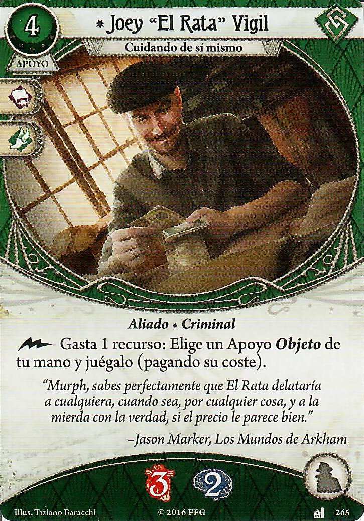 Sabemos que con el Hacha de Bombero Preston va a poder combatir bien, ¿pero qué más hay? Para investigar hay un par de opciones, pero para mi, la mejor opción que tiene este investigador es la vieja y confiable Linterna. Con unos stats tan bajos interesa reducir la dificultad del test en lugar de aumentar nuestros stats. El robo de cartas siempre va a ser un factor débil en Preston, por eso cartas como la Mochila suelen ser bastante valiosas. Y como vamos a llenar el mazo con objetos para que la Mochila haga algo… No os riáis, pero si hay alguien que pueda sacarle partido a Joey «El Rata» Virgil, ese es Preston. En combinación con Leo, no son raros los turnos en los que hagas 5 acciones sin mucha dificultad.