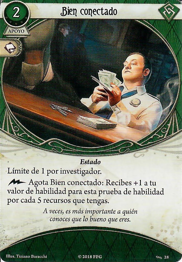 Bien Conectado es una de esas «prestoncartas» que dice Alfred, cartas que salieron en El Círculo Roto para apoyar el modo de juego de este investigador. Al principio de la partida no cambiará mucho las cosas, pero dependiendo de tu estilo de juego, no es raro ver que a media partida esta carta comienza a darte un +5 cada vez que la actives.
