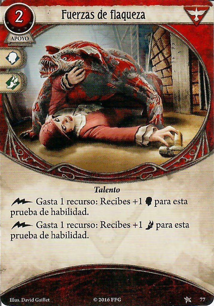 Por último, no hay mejor forma de convertir recursos en bonus que con las cartas Talento de la caja básica. De las dos a las que Preston tiene acceso, Curtido en la Vida y Fuerzas de Flaqueza, yo prefiero esta segunda por cómo cubre los iconos defensivos, dándote algo de la muy necesitada defensa contra el mazo de encuentros.