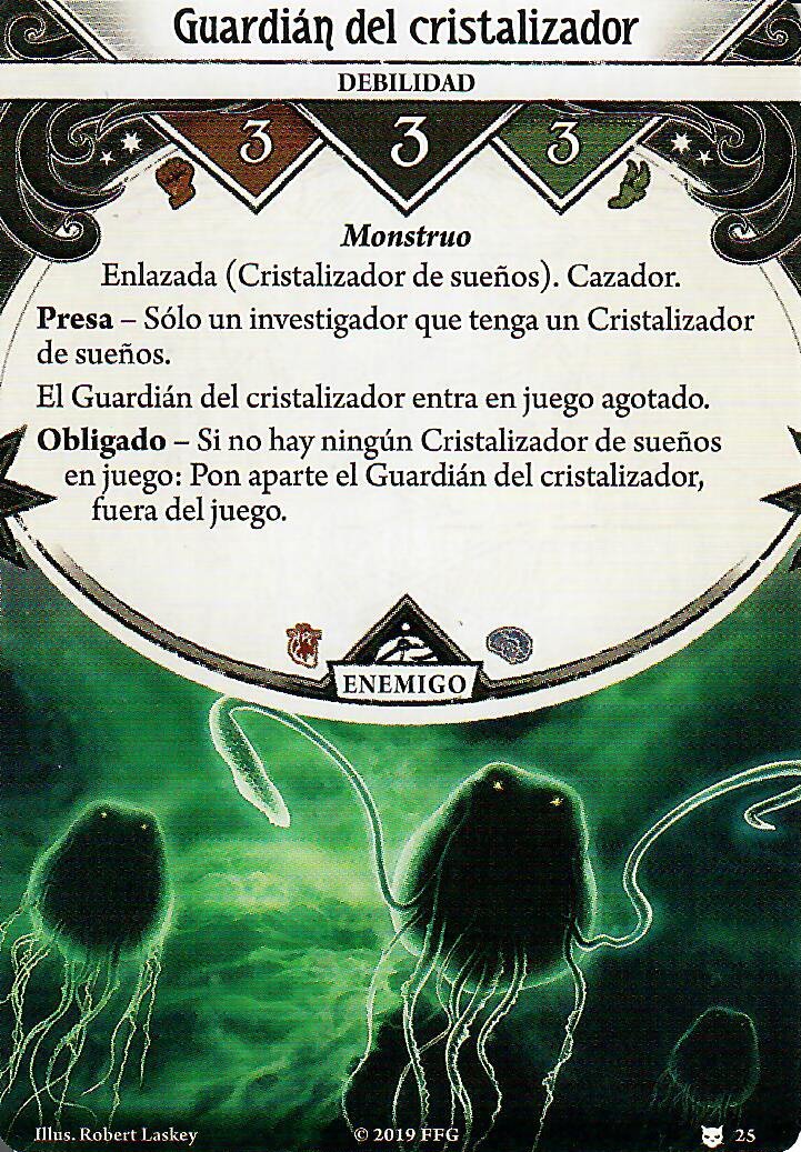 Por otra parte, la debilidad es muy temática tanto con la historia de este investigador como con su mecánica. Es un evento con un coste de nada menos que 10 recursazos, que si sigue en nuestra mano al final de la partida nos provocará un trauma mental. Este tipo de debilidades suelen ser súper duras, pero la verdad… Esta no lo es tanto.