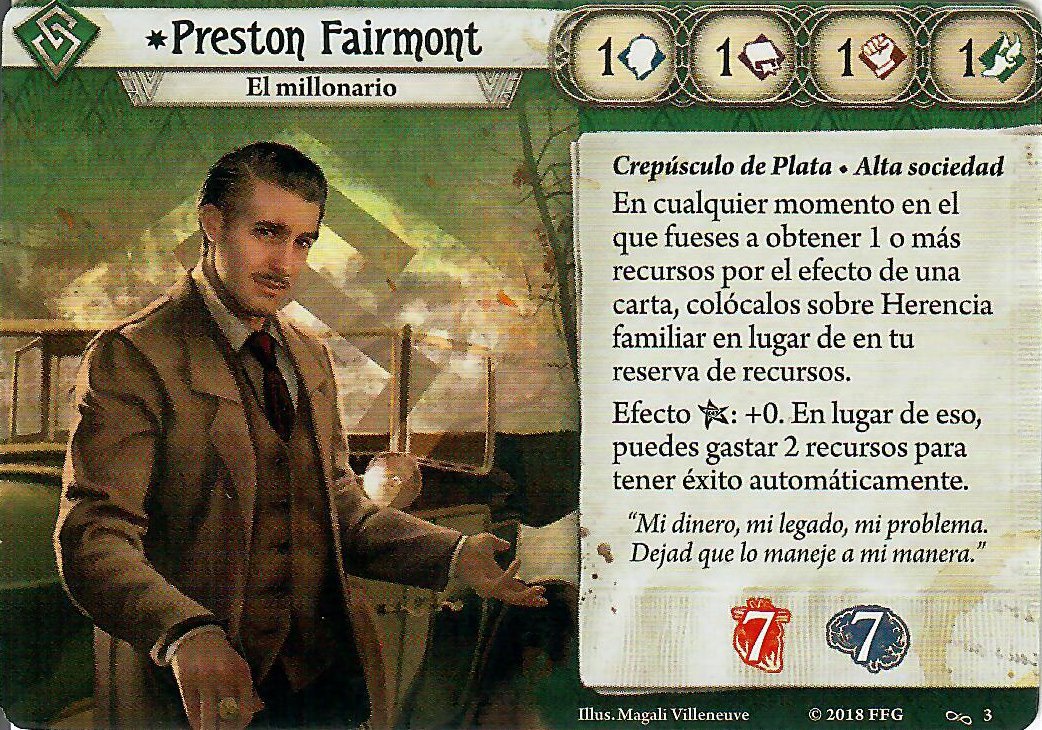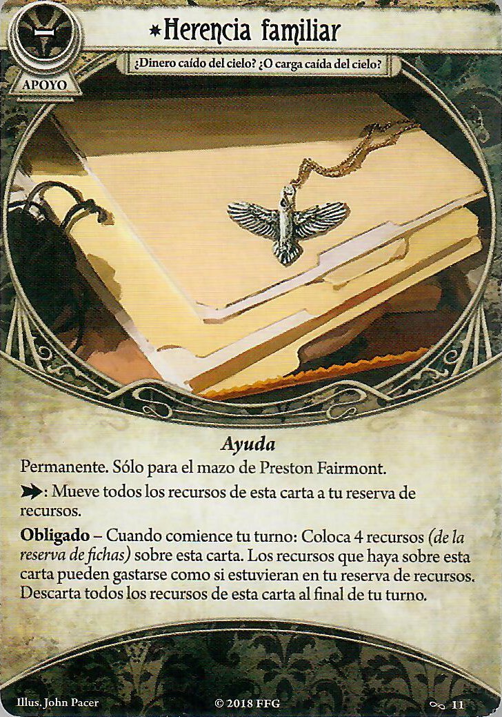 El apoyo personal de Preston, Herencia Familiar, es una carta Permanente, por lo que comienza ya en juego. Como podréis comprobar por el texto de la carta de investigador, va a ser una pieza clave en el funcionamiento de Preston. La cosa va así: siempre que Preston gane recursos por el efecto de una carta, estos recursos se acumulan a Herencia Familiar. Es decir, solo irían a nuestra reserva de recursos aquellos que obtengamos mediante acciones básicas de recursos o cuando robamos carta y recurso en la fase de mantenimiento.