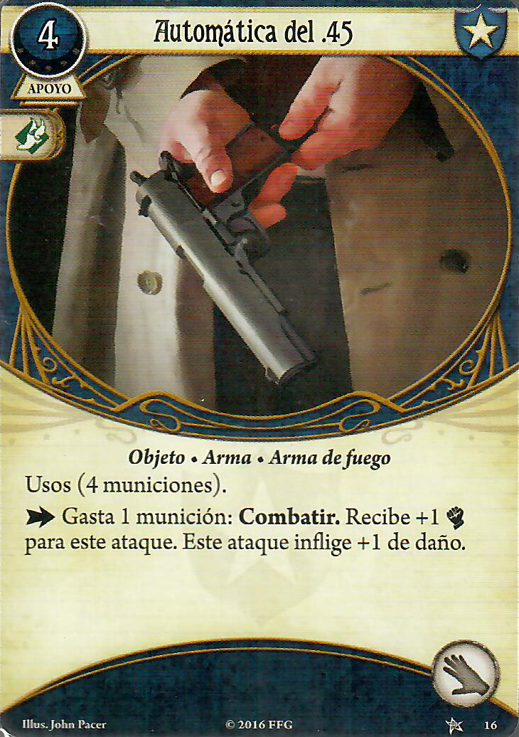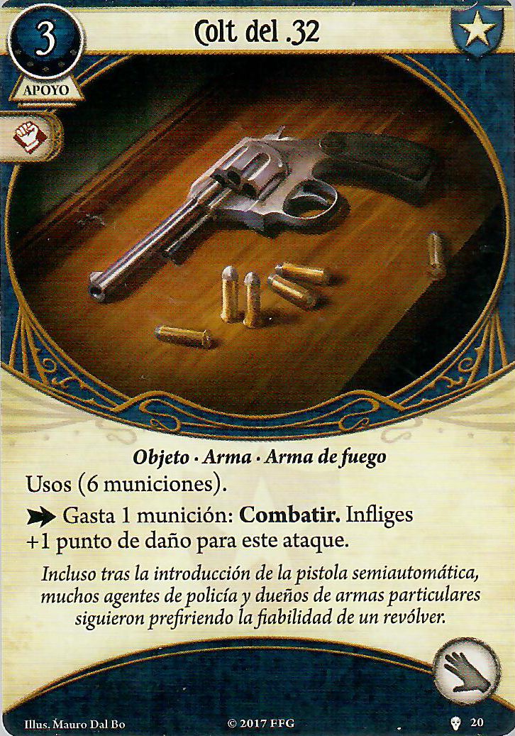 Entre que antes no las podía llevar y que tiene acceso a muy pocas, la verdad es que son testimoniales. Es cierto que la Automática del .45 es muy buena, y si en la otra mano tengo un arma de filo ya bajada, es una opción muy buena, pero desde que salió la Espada encantada y el Cuchillo de carnicero, para mi ha perdido punch. En cuanto la Colt del .32, es un arma muy buena para investigadores que tengan de base 5 de combate, como Mark Harrigan o Tony Morgan, para William prefiero otras que den +1 a puño.