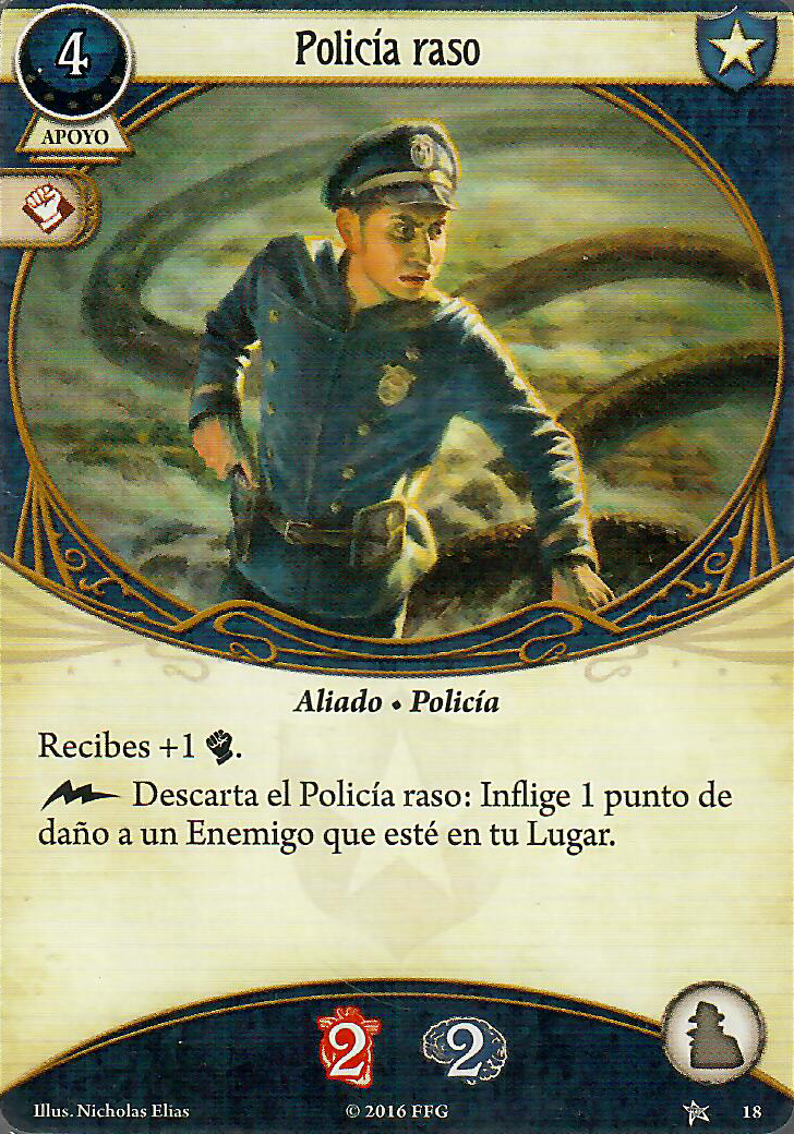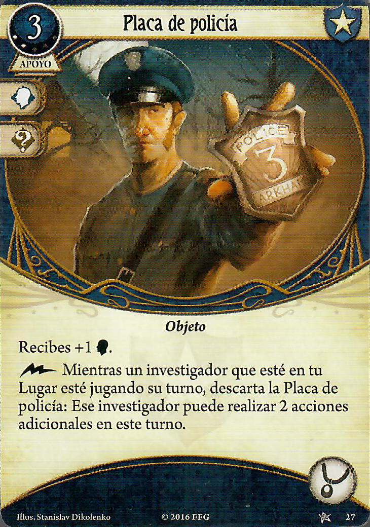Placa de policía, una de las mejores cartas que se le pueden poner a William Yorick. Es prácticamente un As en la manga en la mesa, que mientras está en mesa te sube la cabeza a 4. La única pega es que ocupa el hueco del Recuerdo querido, pero un Cazador de reliquias lo soluciona o si ves que vas sobrado de cordura lo puedes quitar. Pero nunca renuncies a este cartón.