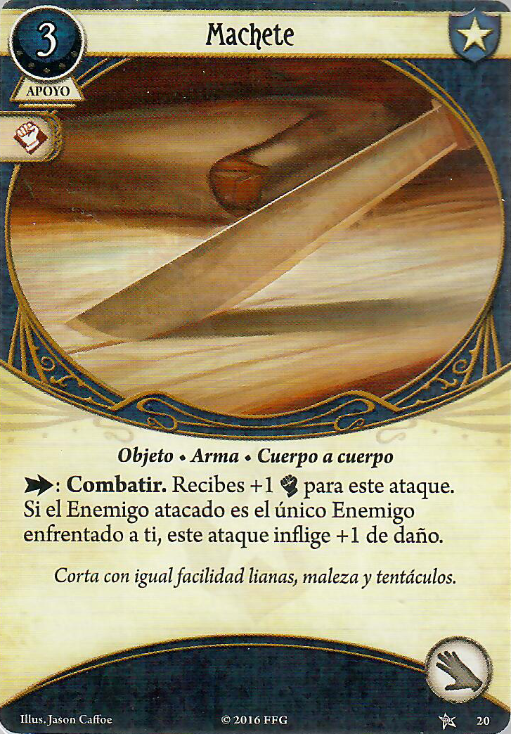 Estas son mis favoritas de todas las que puede llevar William. El Machete no necesita explicación. El Cuchillo de superviviencia va a ser básico si en la sección aliados te hace «tilín» el Perro guardián. La Espada en cantada es una pistola disfrazada, pero mejor, por eso tenía que entrar aquí. Es la mezcla perfecta entre las armas a distancia y el Cuchillo, pudiendo elegir cuando dar el daño +1 (sin descartarla) y cuando atacar sin gastar carga. Es un básico en este mazo desde que salieron las cartas multiclase. El Cuchillo de Carnicero es algo parecido a la Espada encantada, pero además sirve para solventar un problema de Yorick que es que no tiene sentido que lleve a Peter Sylvestre. Así que un arma a la que poder activar el daño +1 cuando quieras y que además cure horror, es un 10. Por úlitmo el Cuchillo parece desentonar algo aquí, pero si te falta alguna de las otras 4 debes llevarlo si o si. Comba con la habilidad de Yorick ya que aunque descartes el cuchillo para el +2 de puño y el daño +1, lo podrás recuperar más adelante. No os imagináis la de veces que el Cuchillo me ha dado el daño +1 que necesitaba cuando estaba enfrentado a dos enemigos y el Machete no podía.