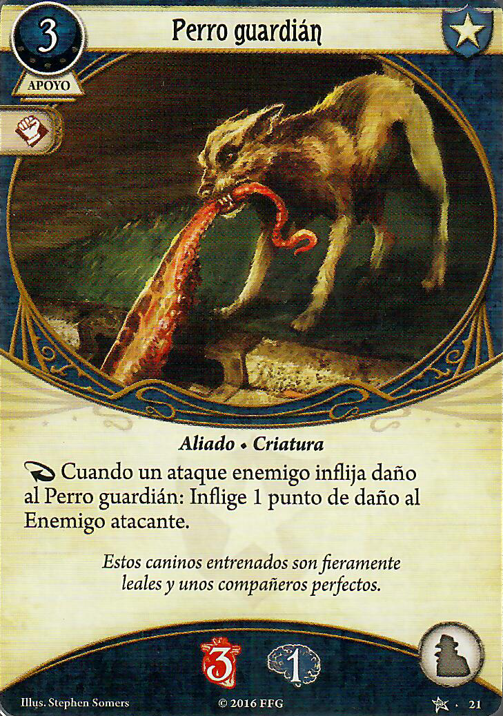 Otro de los aspectos que intento tener siempre cubiertos a la hora de construir cualquier mazo, es la del manejo del daño y el horror. A no ser que vaya a jugar con alguien y acordemos que este apartado va a quedar únicamente cubierto por su mazo, siempre intento llevar algo para salir del paso en caso de necesidad. Esto cobra especial importancia en el mazo de William si decides que es una buena opción ir con el Cuchillo de supervivencia y con el Perro y esperar a que te peguen.