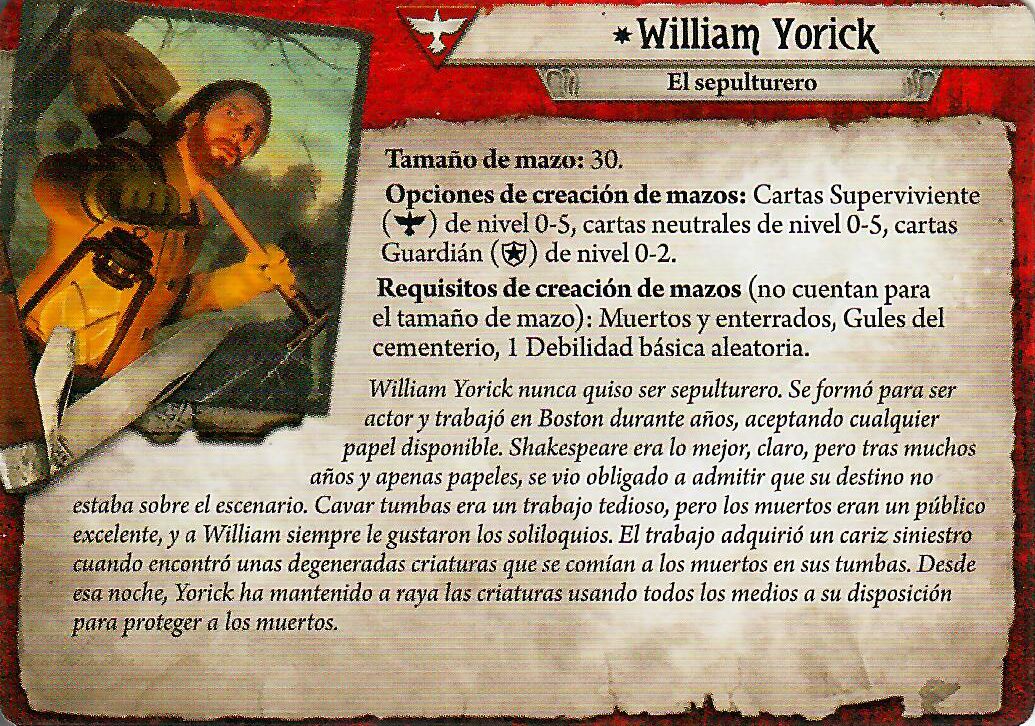 William es un protosuperviviente orientado al combate. Es así, tiene la característica típica de los supervivientes que es la de rescatar cosas de la pila de descartes, en este caso Apoyos. Y además tiene un valor de 4 en combate lo que hace de él un investigador ideal para matar bichos ¿Soñaste alguna vez con un investigador con municiones ilimitadas? Yorick fue el primero.