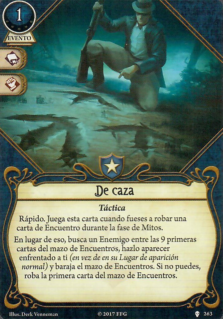 De caza, ¡Yo me encargo de esto! y First watch (supongo que Primer vistazo). Las cartas de Guardián que manipulan el mazo de encuentros, si te quedan hueco siempre puedes añadir un par, nunca van a venir mal y pueden sacar a tus compañeros de apuros o hacerte a ti robar el enemigo que necesitas.